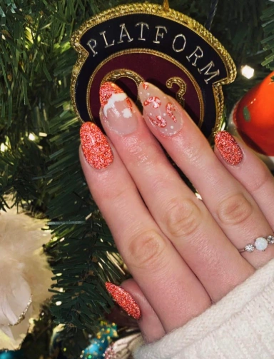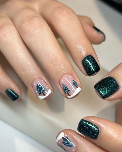 Picture deep green polish catching light like pine needles after snow. That’s what these nails give. Paint most nails a rich emerald shade, but leave one nail for sparkle — a glittering emerald accent that looks alive when it hits the sun. These Christmas Nails bring a forest kind of calm, like walking through evergreens with soft snow crunching beneath your boots.