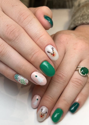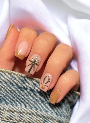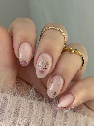 Not everyone wants bold red. Try a muted pink base — it feels soft, almost romantic. Then add a tiny reindeer on one or two nails. Not perfect, just cute. A thin line of gold along the edges or a single gold stud makes it feel finished. These Christmas Nails whisper holiday spirit instead of shouting it.