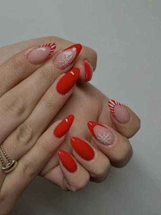 Crimson Almond Nails With Santa and Candy Cane Designs
