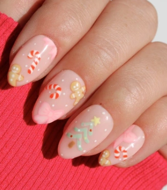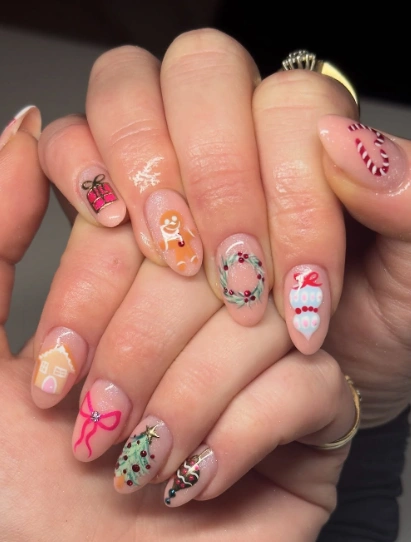 Sheer Almond Nails With Hand-Painted Holiday Icons