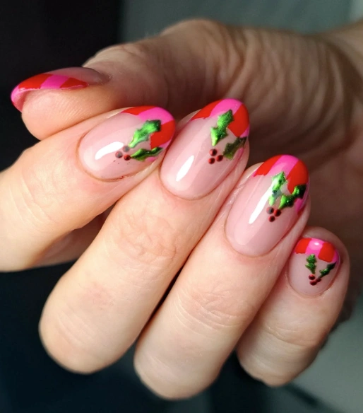 Vintage lovers, this one’s for you. Paint alternating pink and red French tips, then add small green holly leaves and berries near the cuticle. It’s old-fashioned in a good way — something your grandmother might have worn, but modern enough to feel stylish now. These Christmas Nails carry that warm, retro glow of Christmas lights from the 70s.