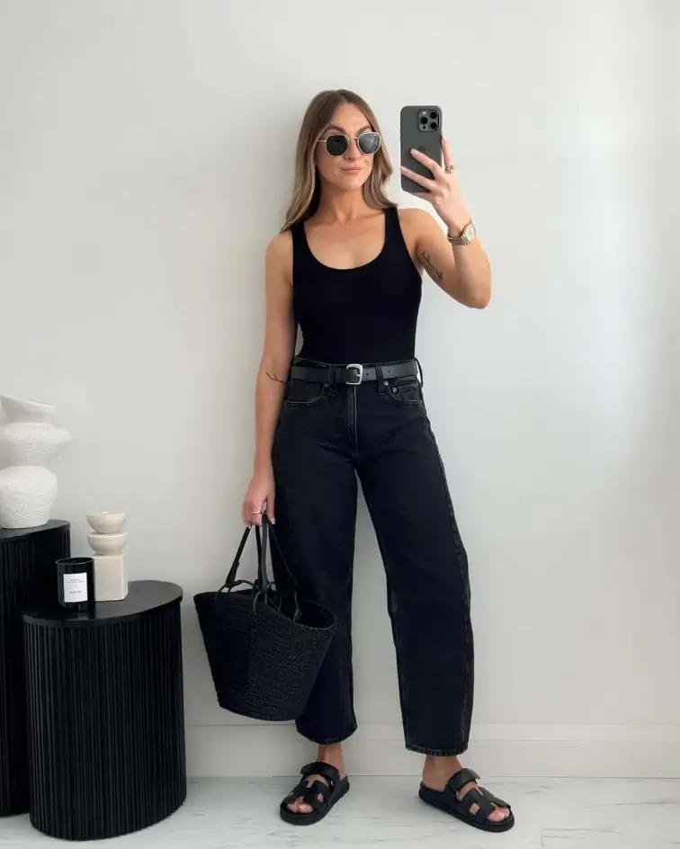 Monochrome always looks polished. Wear Black Jeans with a black tank and clean slide sandals. Mix textures for depth, like ribbed cotton with smooth denim and a pebbled leather bag. A small gold or silver buckle on the belt adds just enough shine.