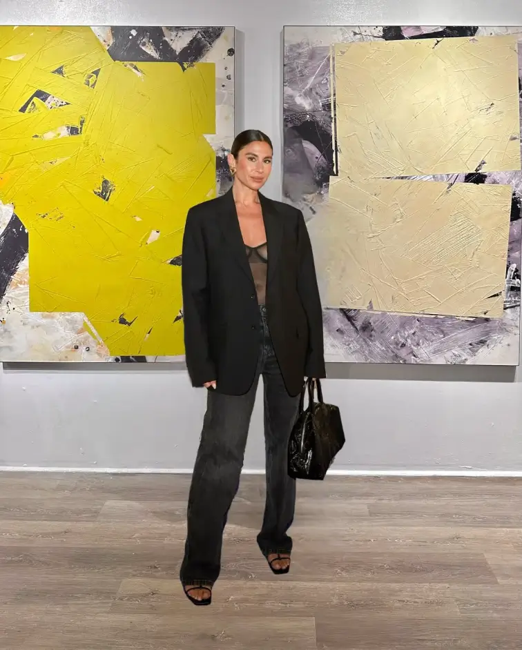 For evenings, switch the tee for a sheer blouse and add a slouchy blazer. Black Jeans ground the transparency so the outfit stays chic rather than loud. Finish with heeled sandals and a small shoulder bag. If sheer feels bold, layer a soft camisole in a close skin tone.