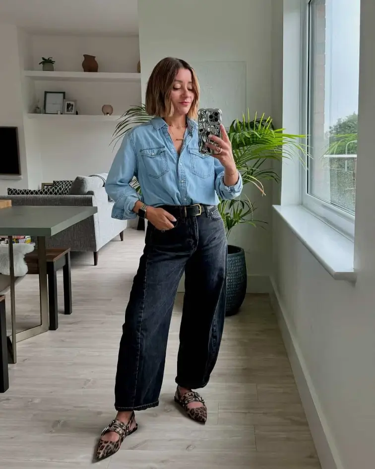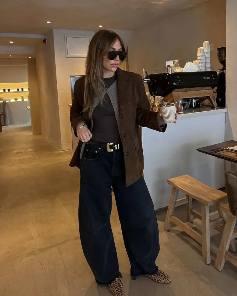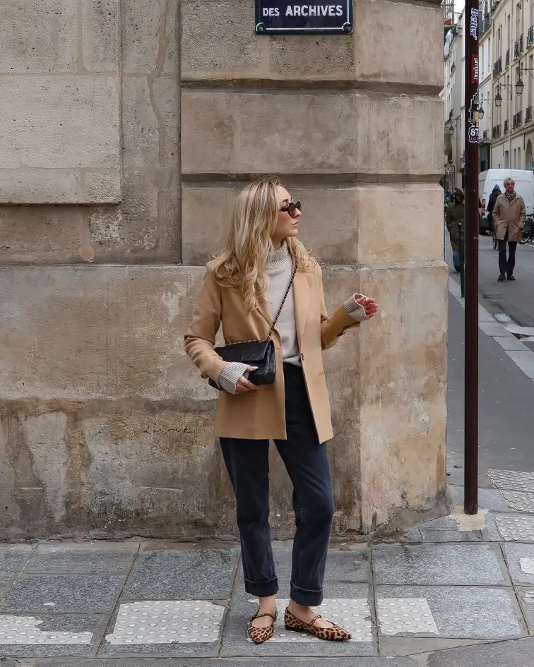 Add a fun twist to your black jeans outfit with printed shoes. Leopard flats go perfectly with black jeans, especially when paired with a cozy turtleneck and a light beige blazer. This look is cute, comfy, and ideal for casual workdays or weekend plans.