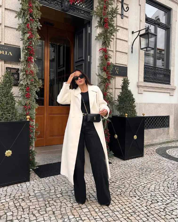 Want to stand out a bit more? Try a black bodysuit under a light-colored coat, like cream or beige. The contrast between the black and off-white makes the outfit pop. This black jeans outfit is perfect for colder days when you still want to look stylish.