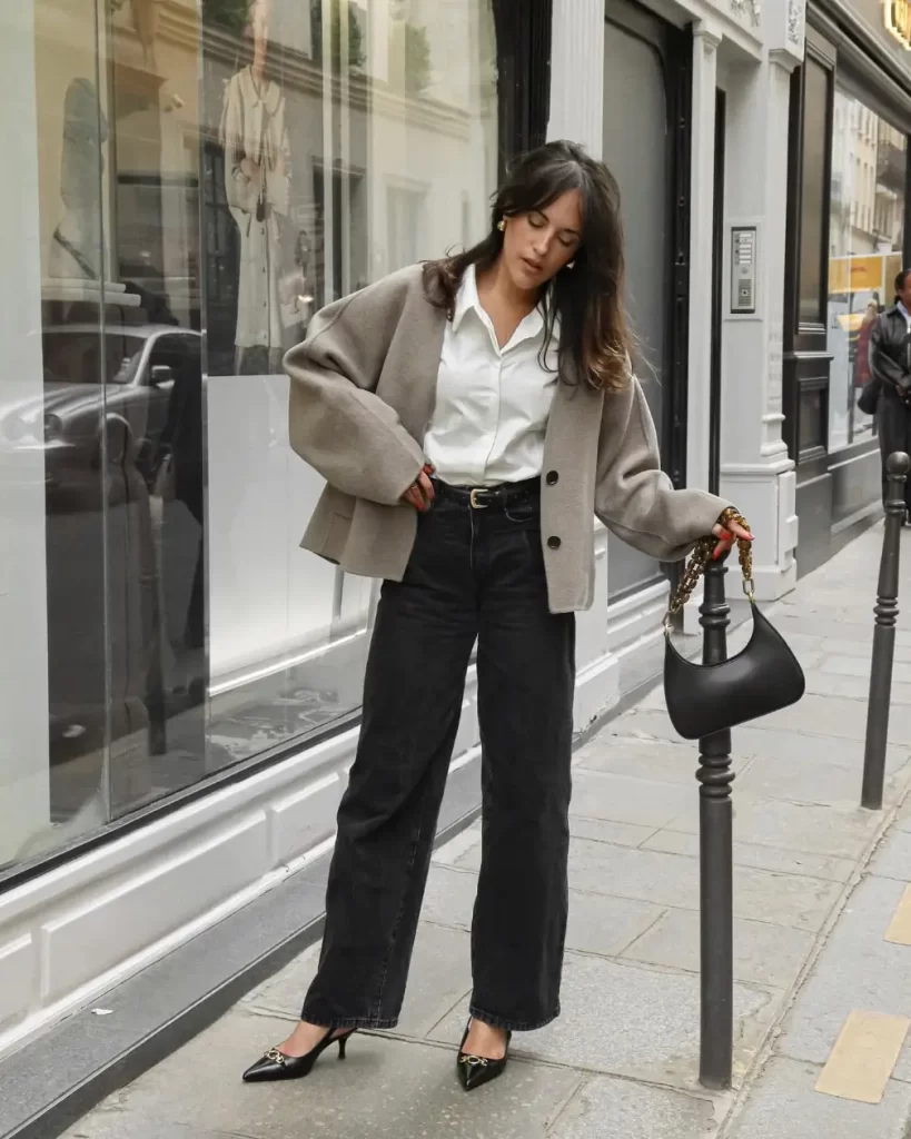 Want something that feels a bit more polished? Tuck a button-up shirt into your black jeans and add a cropped shacket (a mix between a shirt and a jacket). Put on some heels, and you’ve got a smart black jeans outfit that’s perfect for work or a lunch date.