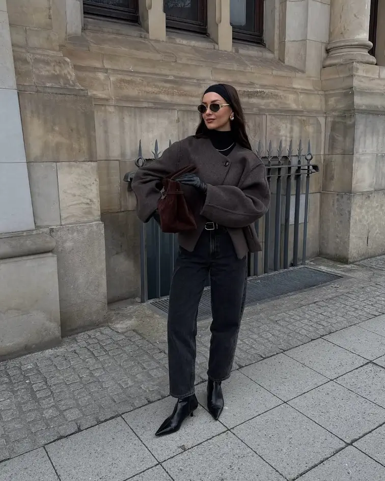 This time, style the cropped shacket for cooler weather. Wear it over a black turtleneck, and finish with ankle boots. This black jeans outfit is warm, stylish, and great for fall or winter days when you still want to look trendy.