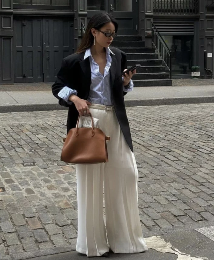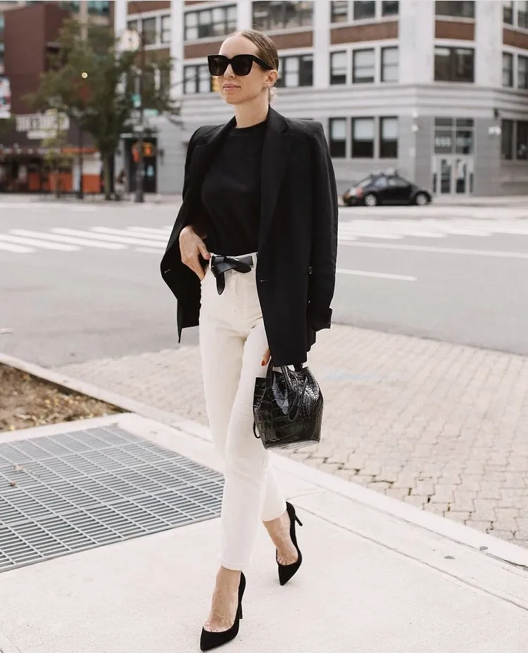 Black-and-White Balance: Blazer, Button-Down, White Pants