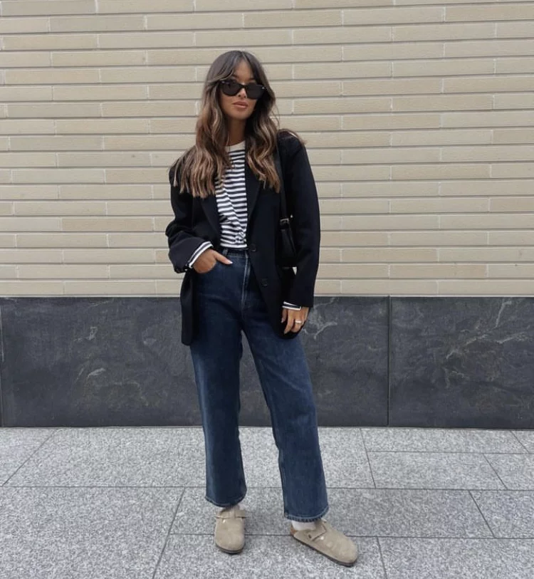 There’s something nostalgic about a striped tee under a classic blazer. It feels familiar but still fresh. Add clogs and straight jeans to capture that relaxed retro mood. These Blazer Outfits carry a touch of old-school charm while staying perfectly wearable in today’s world.