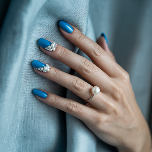 If you’re aiming for a sophisticated, elegant look, try adding pearl embellishments to your Blue French Nail Ideas. Pearls can be added near the cuticle or along the edges of the blue tips to create a refined, high-end feel. The pearls add a touch of luxury and femininity, making this design perfect for weddings, galas, or any elegant event.