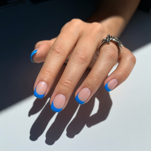 For a more luxurious twist on Blue French Nail Ideas, add silver accents to your nails. Whether it’s a thin silver line just above the blue tip or a few silver dots scattered across the nails, these accents create a high-end, polished appearance. Silver pairs beautifully with blue, making this design perfect for anyone seeking a touch of glam without going overboard.