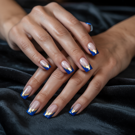 Blue French Nail Ideas can take on a luxurious feel when combined with gold foil. Gold foil accents added to the tips or along the sides of the nails bring a touch of sophistication and glam. The combination of deep blue and shimmering gold creates a visually stunning design, perfect for formal events or whenever you want your nails to sparkle.