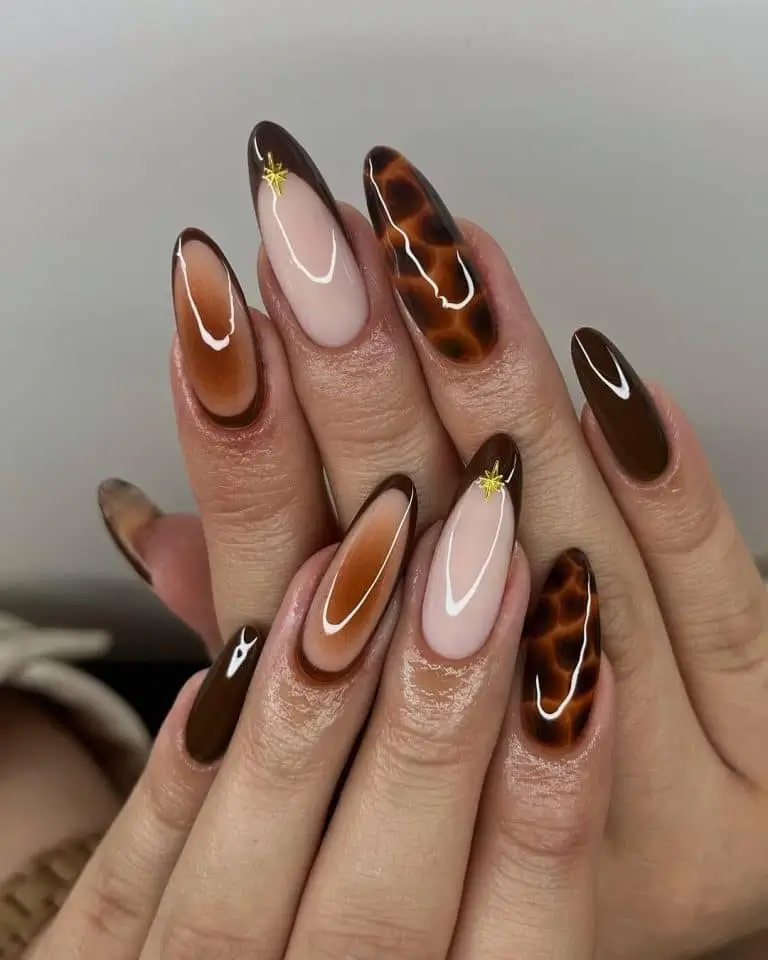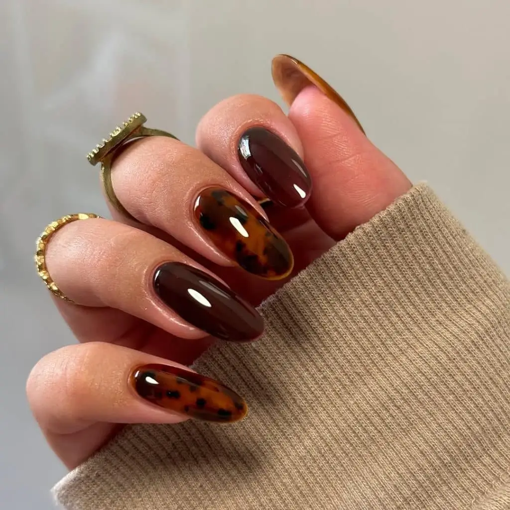For those who love earthy tones brown nail designs inspired by tortoiseshell patterns are a great way to embrace natural beauty. The rich mix of dark and light brown shades mimics the look of tortoiseshell creating a bold and unique design. It’s warm cozy and earthy making it perfect for fall or anyone who loves nature-inspired styles. Whether you go for a full tortoiseshell pattern or accent your nails with it this design brings out the beauty of brown in a way that feels both sophisticated and grounded.