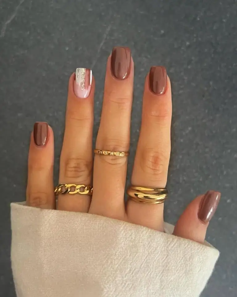 Want to make your nails sparkle? Try brown nail designs with a shiny brown base and some glitter added in! The shiny brown makes your nails look smooth and beautiful while the glitter gives them a fun dazzling touch. Whether you go for glitter on the tips or a full glittery design this combination will make your nails stand out. It’s perfect for a night out a special celebration or anytime you want to add some glam to your look. These nails shine in the best way possible!