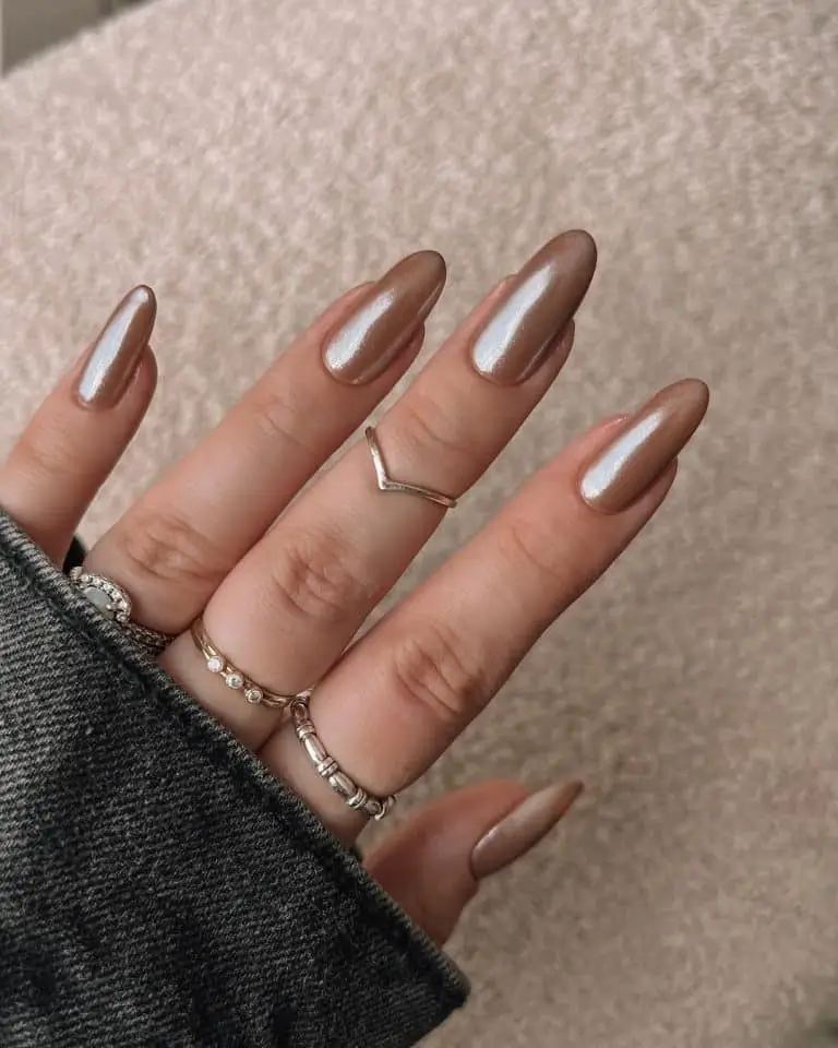 When you’re feeling like adding a little sparkle to your look brown nail designs with chrome cocoa vibes are a great choice. The smooth glossy finish gives your nails a shiny almost mirror-like effect. The deep cocoa color is rich and sophisticated while the chrome shine makes it stand out giving your nails a futuristic cool look. Pair these nails with your favorite denim and you’ve got a stylish and effortless combination. This design is perfect for those days when you want to add a touch of glam without going overboard.