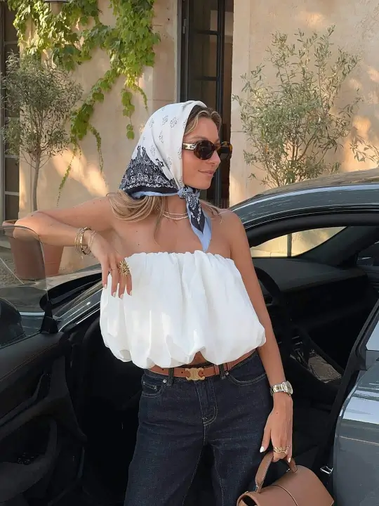 Who says scarves are only for your neck or waist? A large scarf can easily be transformed into a trendy, stylish top. Simply fold it into a triangle, tie the ends around your neck, and let the point hang down at the center of your chest. This chic, minimalistic top pairs beautifully with jeans, skirts, or even shorts. It’s a great way to incorporate scarves into your warm-weather wardrobe while staying comfortable and on-trend.