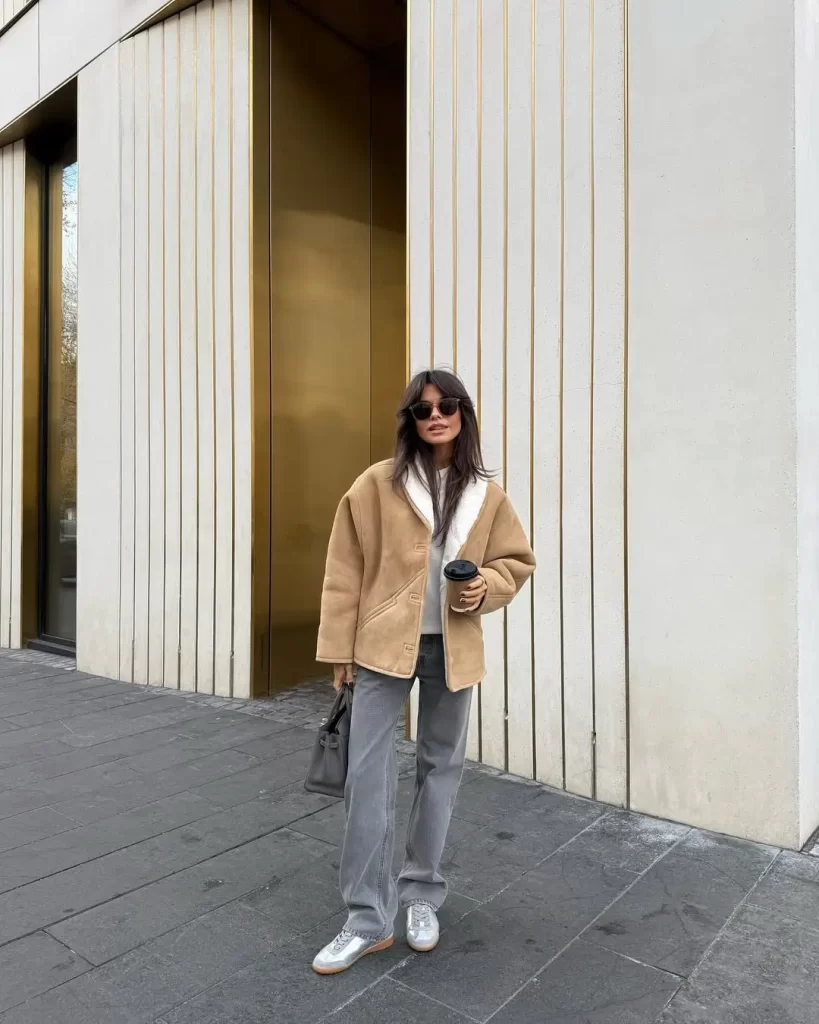 When the temperatures drop, a beige shearling jacket is a great option for staying warm while still looking stylish. Its soft, plush texture will keep you cozy, and it pairs beautifully with jeans or leggings for a laid-back yet chic look.