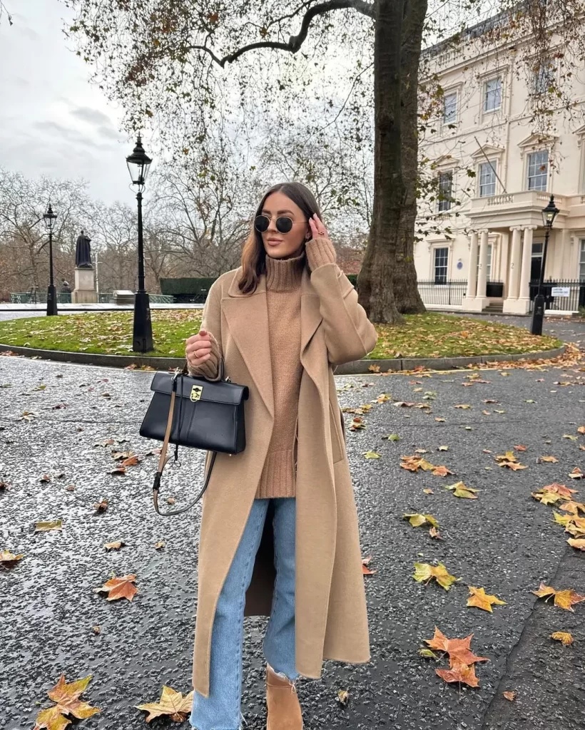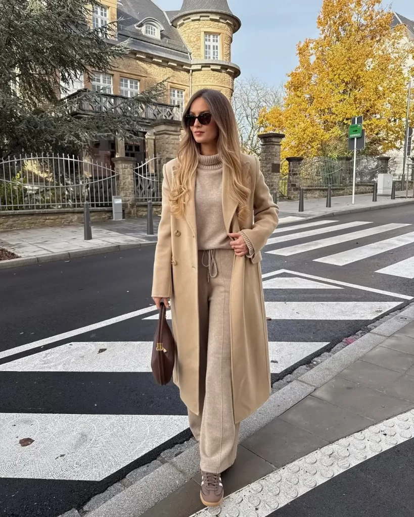 A classic beige coat is always a good choice. It’s stylish, versatile, and pairs perfectly with any outfit. Whether worn over a sweater and jeans or a dress, this coat adds an air of sophistication to your Christmas market look while keeping you warm.