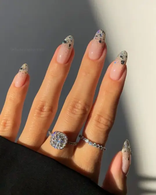 Lay down a nude or pale gray base. Tap fine silver glitter from the middle to the tips for a soft frost effect, then seal with a thicker top coat so it feels smooth. Your nails will catch the light without looking chunky. These Christmas Nails sparkle in photos yet stay office neat.