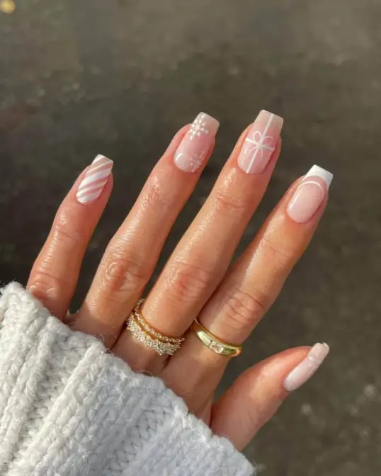 Start with a nude or blush base. Add thin gold striping like gift ribbon or a tiny metallic bow on one accent nail. The result looks luxe while staying neutral enough for every outfit. These Christmas Nails give subtle shine that fits workdays, dinners, and last-minute parties.