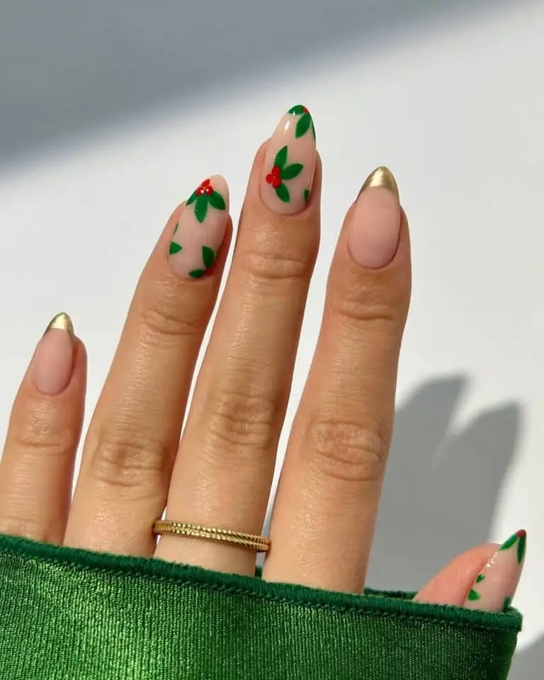 Refresh classic French tips by choosing white or deep red and adding petite berry dots with micro green leaves right along the smile line; this flirty twist stays tidy when nails are short and pairs beautifully with cozy cardigans or sequined skirts your Christmas Nails will look playful, polished, and ultra-shareable, delivering that “festive but not fussy” energy everyone loves during the holidays.