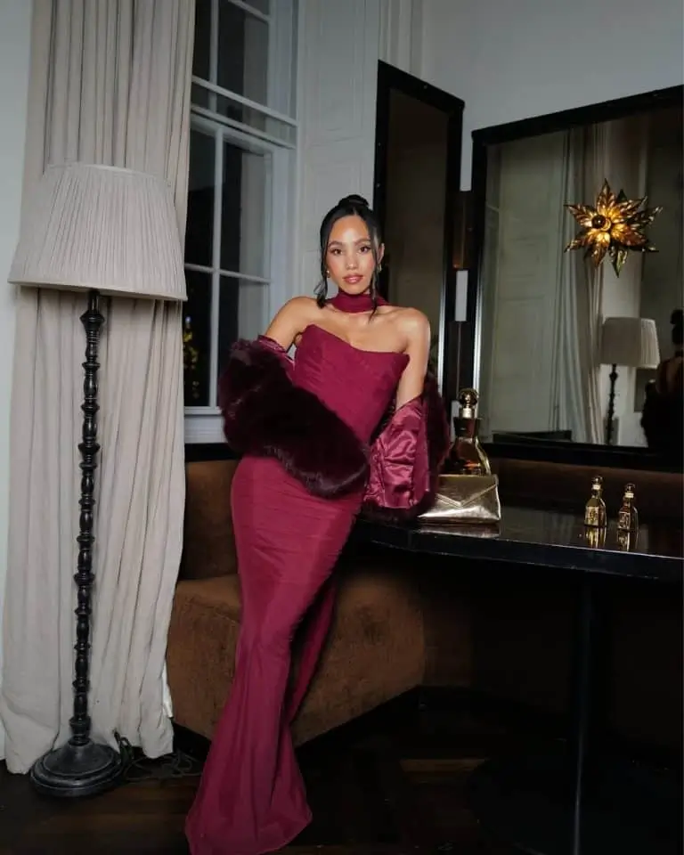 Red is the easiest holiday upgrade. Try a red blouse, tie, shoes, or even a red lip. Burgundy and deep cherry feel bold yet professional. One pop of red lifts the whole Christmas Work Outfit instantly.