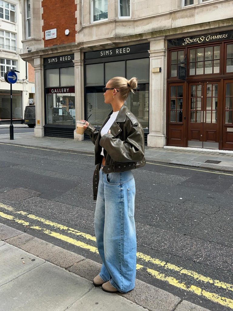 I love this combo for days when my brain says “put effort in” but my body says “absolutely not.” A soft leather jacket over a basic tee with relaxed denim hits that perfect city-casual vibe.