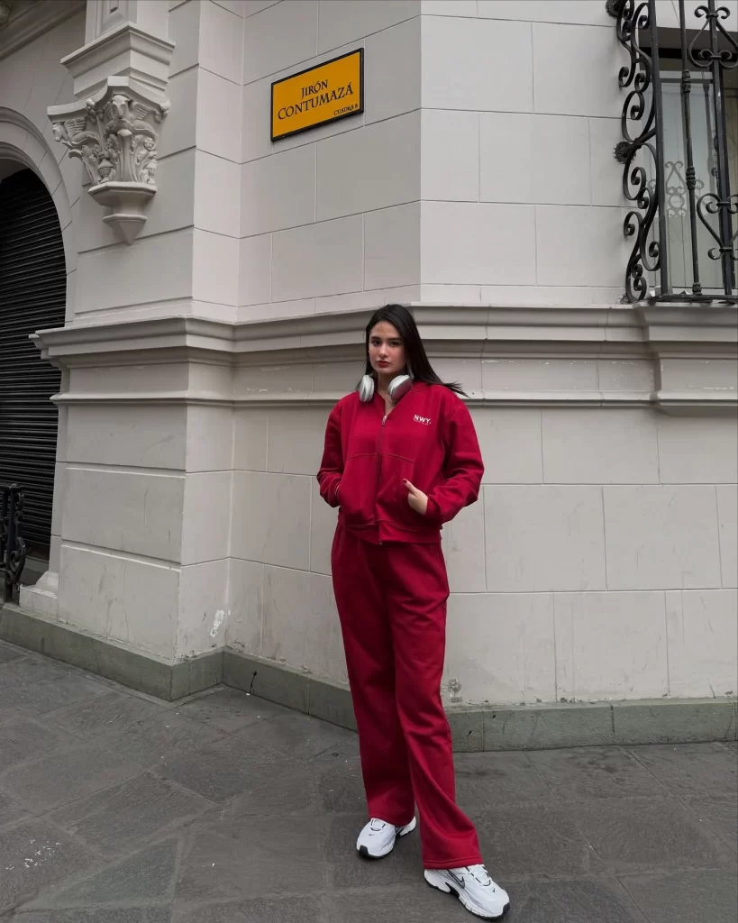 I love monochrome outfits because they scream “I tried,” even when you absolutely didn’t. A matching red sweatshirt + sweatpants set feels comfy and looks spicy.