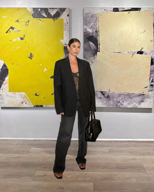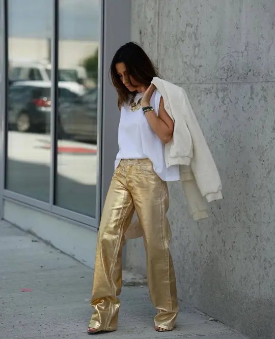 Nothing says you’re here to shine like a pair of gold metallic trousers. Pair them with a clean white top to balance the sparkle and let the pants do the talking. This is one of those concert outfit ideas that’s glamorous yet surprisingly easy to pull off — ideal for night concerts or venues where you want to make a sleek, modern statement.