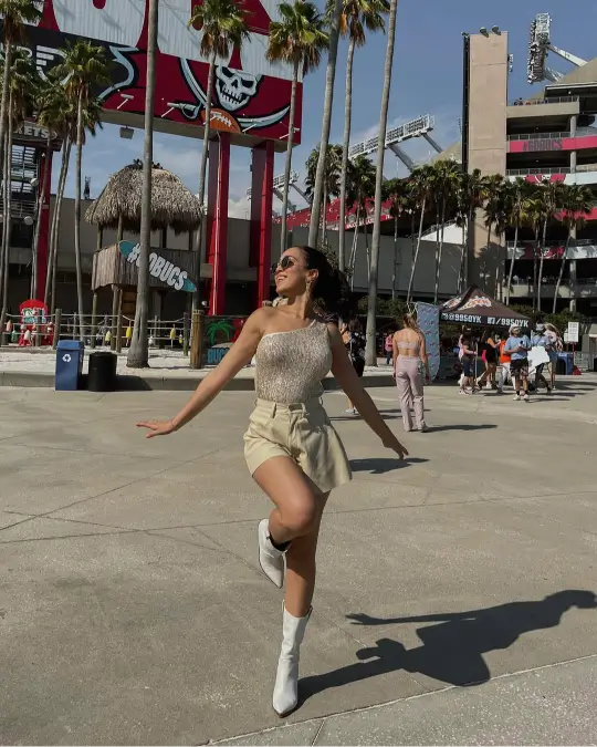 This fiery combo is for those who want to make a statement without saying a word. A sleek bodysuit gives you that sculpted silhouette, while high-waisted suede shorts add texture and edge. Finish with statement heels, and you’re concert-ready in one of the boldest concert outfit ideas out there. It’s equal parts sexy and cool — perfect for turning the crowd into your runway.