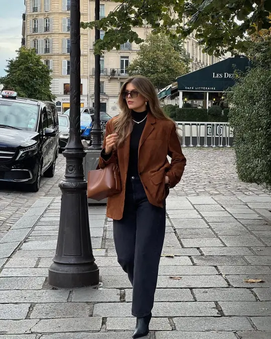 A brown suede blazer has a way of making you feel instantly pulled together. It’s soft, it’s rich in color, and when you toss it over your favorite jeans, the whole look just works. The denim keeps things relaxed, the blazer adds polish, and together they strike that perfect “I didn’t try too hard, but I still look amazing” vibe. Add ankle boots or loafers and you’ve got one of those cute fall outfits that’s perfect for coffee dates, weekend strolls, or casual Fridays at the office.
