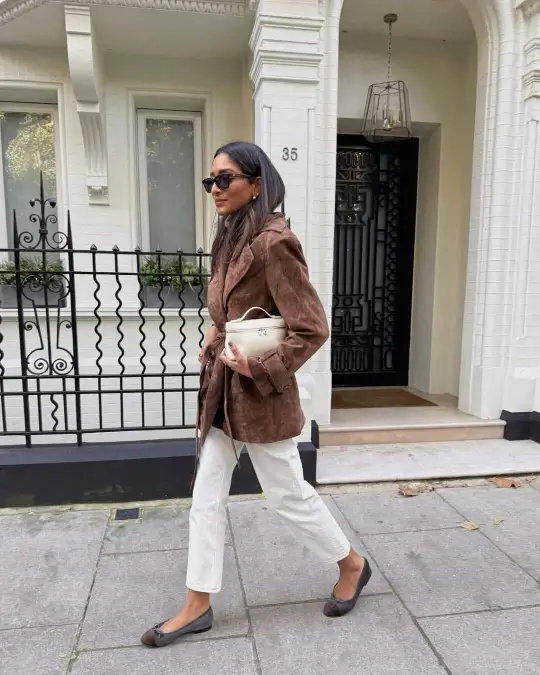 White Cropped Jeans with Brown Suede Jacket for a Fresh Autumn Look