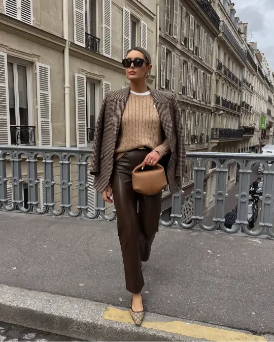 Plaid Blazer with Brown Leather Pants for Seasonal Chic
