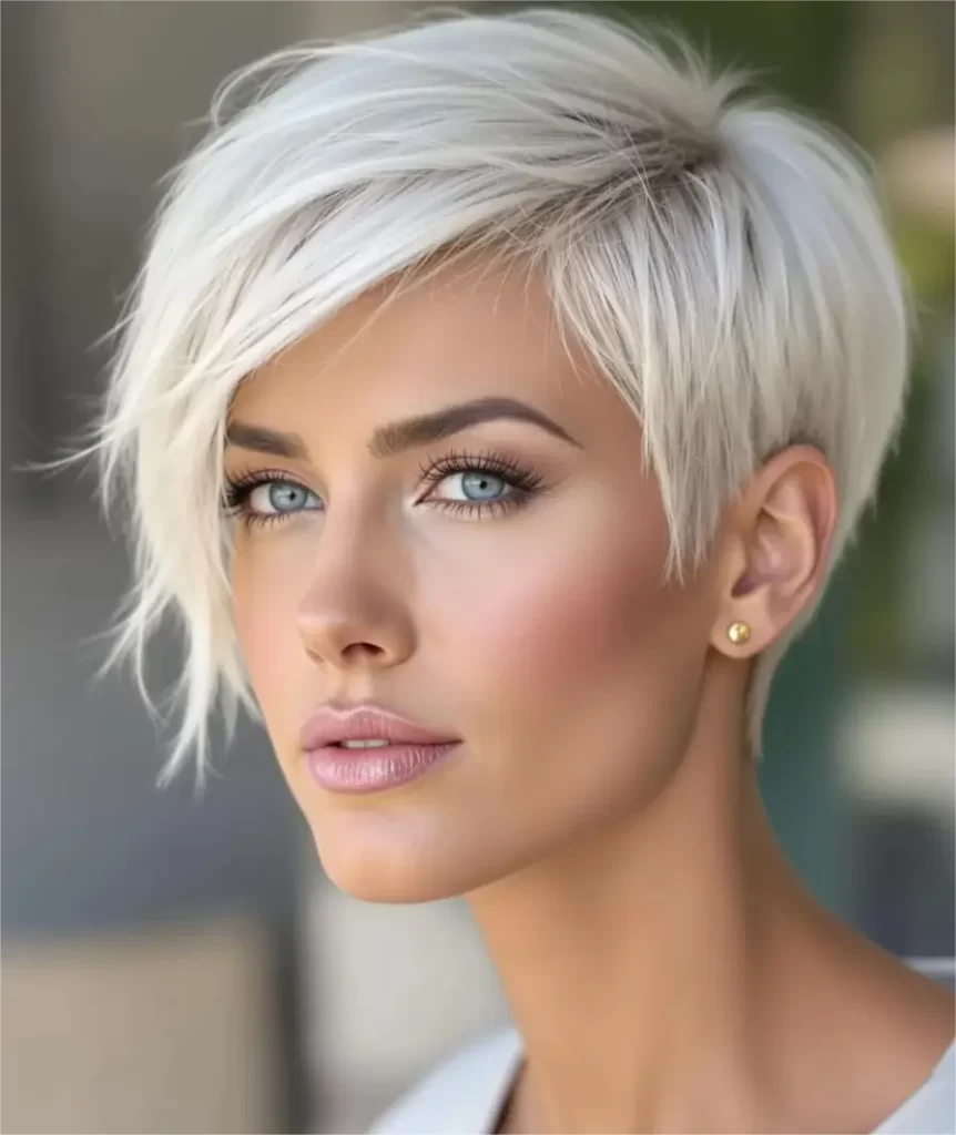 If you want something a little more daring, a platinum pixie cut with side-swept bangs is a great choice. The platinum color is bright and eye-catching, while the pixie cut is short and chic. The side-swept bangs add a soft touch, making this style a fun yet elegant option. If you’re looking to try a bold new look, this cute short hair will definitely make you stand out.