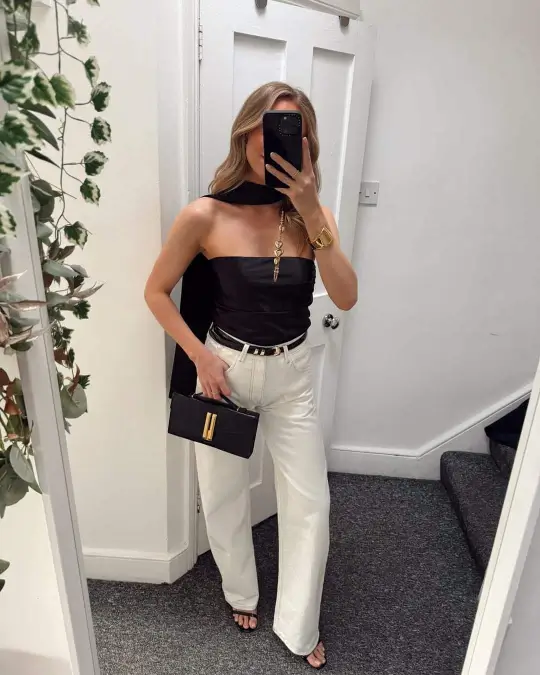 Keep your best denim and upgrade the top for instant polish. Satin, feather trims, puff sleeves, or a corset style add drama without losing comfort. Straight or wide leg jeans with pointed pumps or block heels always look refined. A neat belt and a compact clutch finish the look, making this high low mix one of the most reliable Dinner Outfits for last minute plans.
