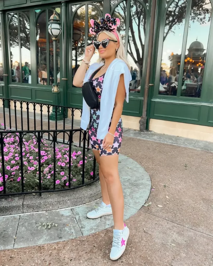 A simple sundress is a one-and-done win. Choose a lined style that isn’t see-through in bright sun and add bike shorts for rides. Pair with white sneakers for an easy, camera-ready Disney World outfit.