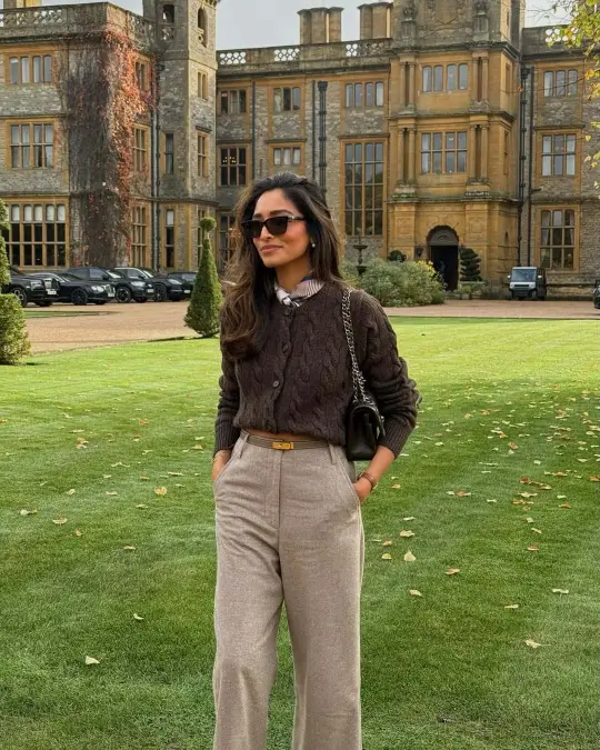 Use this easy formula when you do not want to think. Start with an ivory turtleneck and cream trousers. Layer a checked blazer, then a camel overcoat. Add riding boots, leather gloves, and a chocolate shoulder bag. Soft makeup, natural hair, and you are done. This repeatable combo keeps your Fall Outfits refined and camera ready.