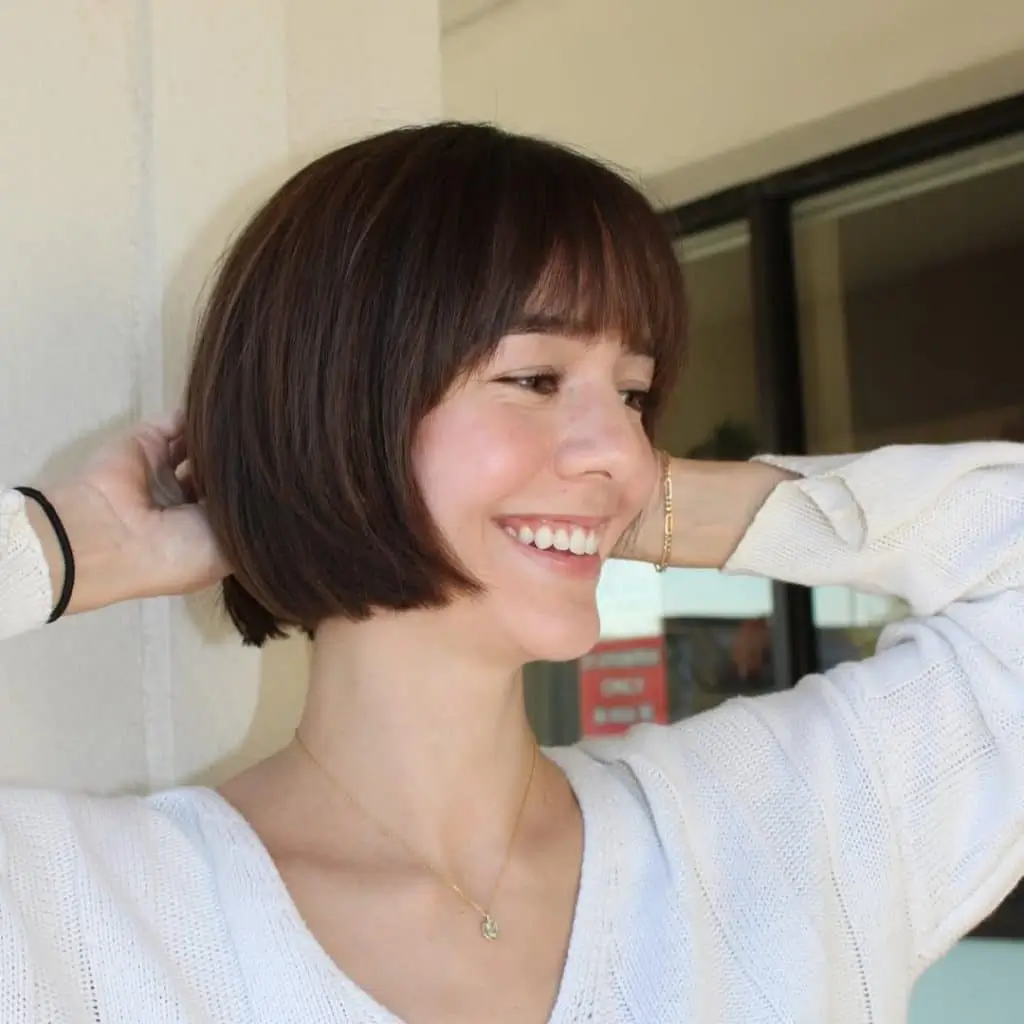Ask for feathered bangs that sit just below the brows and taper at the temples so they blend into the bob. Blow-dry with a small round brush and a touch of mousse to keep them light and floaty. This version gives the face a fresh, lifted look without heavy styling.