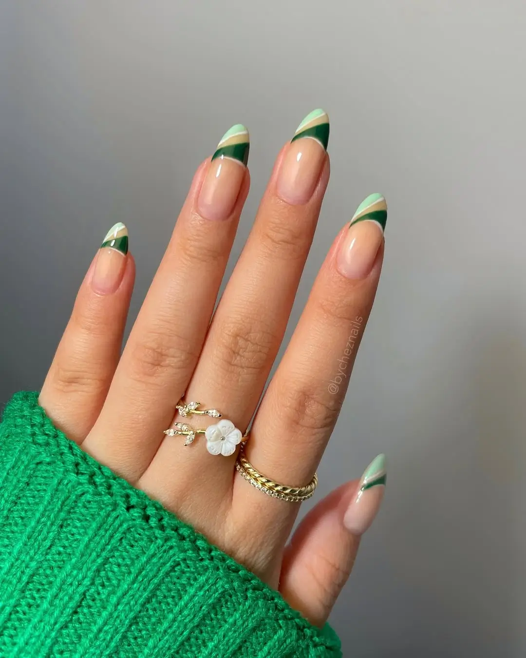 Bring the forest to your fingertips with moss and pine accents on a sheer nude base. Try a thin French line in sage and one accent nail with tiny fern strokes near the cuticle. The look is crisp, calm, and surprisingly versatile. French Tip Nails in green tones feel modern, especially with chunky sweaters, tweed coats, and earthy accessories that echo the outdoors.