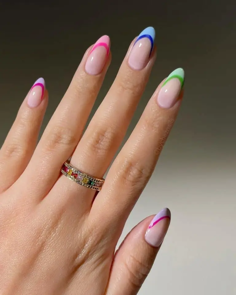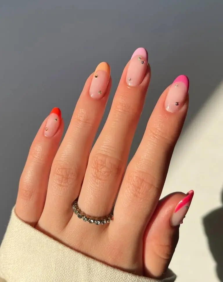 Paint a different pastel on each tip, then dot a tiny crystal near the smile line for sparkle that catches the light. Keep the base sheer or soft pink to let the colors breathe. This joyful update to French Tip Nails feels celebratory and works for vacations, festivals, and birthdays. The gems are subtle enough for day, yet photogenic under evening lights.