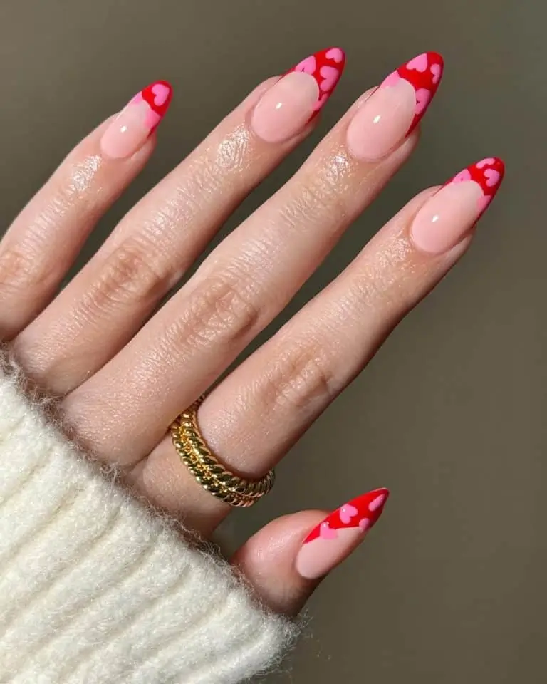 Lean into date-night energy with soft pink bases and cherry red edges. Keep the line delicate for a classy vibe, or thicken the smile for extra drama. Add one accent nail with a tiny white heart for a sweet finish. This take on French Tip Nails feels romantic without being over the top, and it pairs beautifully with rose lipstick, satin dresses, and cozy February plans.