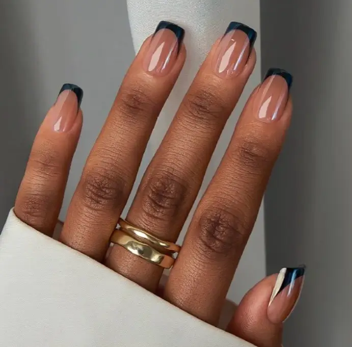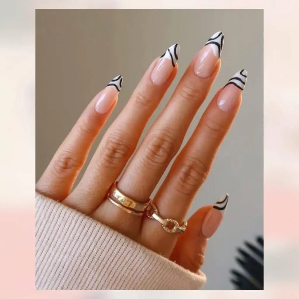 Swap a plain tip for a crisp white edge, then add ultra-thin black zebra strokes on a single accent nail. Keep lines organic and slightly curved to mimic real stripes. The monochrome palette guarantees elegance while adding attitude. French Tip Nails in black and white pair effortlessly with blazers, denim, and gold jewelry, taking you from office hours to evening plans.