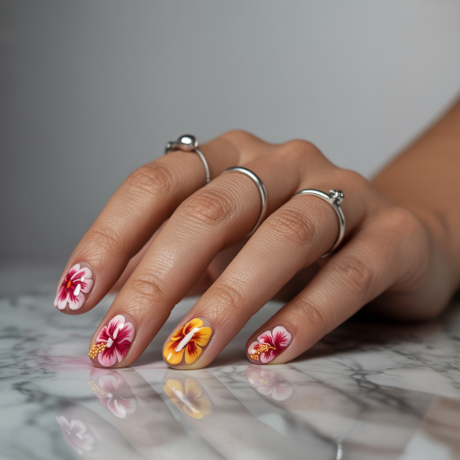 If you want a dramatic, high-impact design, Hibiscus Flower Nails are the way to go. This technique involves sculpting the hibiscus flowers out of acrylic or gel, creating a realistic, raised effect. These nails offer a tactile, sculptural appearance that stands out. These designs are perfect for those who want to make a bold statement and add a unique, artistic flair to their nails.