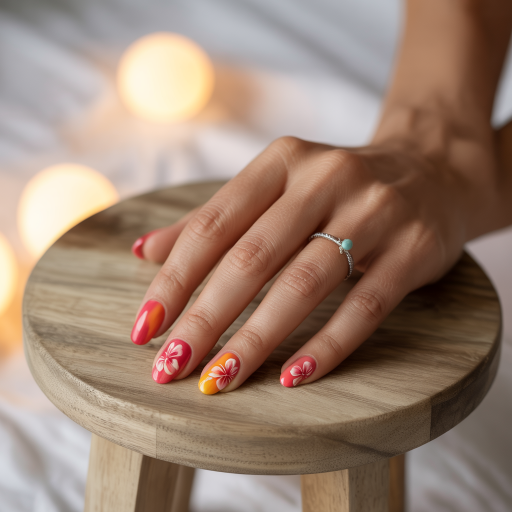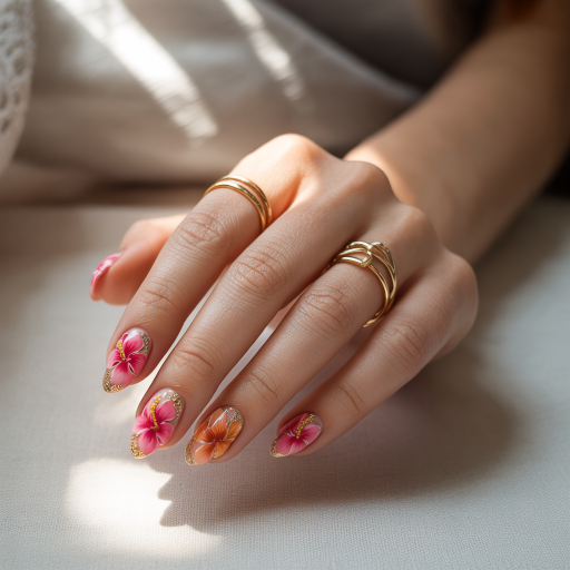 For a sun-kissed, tropical vibe, consider Hibiscus Flower Nails with a gradient effect. The gradient, transitioning from soft pinks to warm oranges, mirrors a beautiful sunset, creating an overall tropical feel. The hibiscus flowers placed over the gradient background add a delicate yet lively touch. This design works well during warmer months, and the seamless color transition gives your nails an effortlessly chic look.