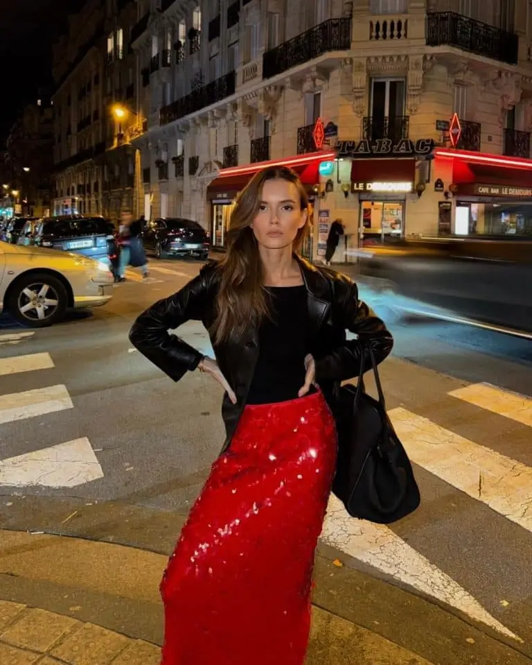 Make a confident entrance with a red Sequin Skirt under a black leather jacket, add a fitted black top, sleek pumps or ankle boots, and a structured bag so the color leads, the lines stay clean, and the vibe feels bold, powerful, and totally unforgettable at night.