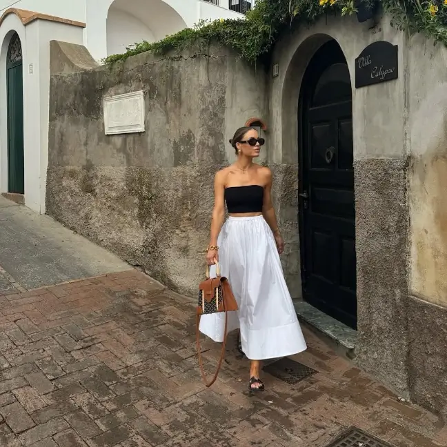 Looking for versatility? The white maxi skirt is your go-to piece. It’s cool, comfortable, and pairs beautifully with nearly everything — from cropped tops to linen shirts. Dress it up with wedges for dinner or down with sandals for sightseeing. As far as Italian summer outfits go, this one is equal parts practical and stylish.