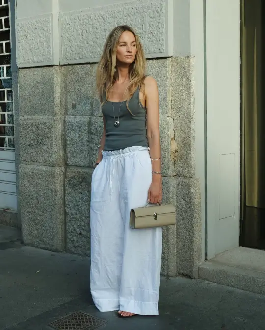Linen trousers are an absolute summer essential. They are airy, lightweight, and ideal for keeping cool while still looking polished. Pair them with a simple top and comfortable sandals for market mornings, seaside lunches, or an evening boat ride. This look is effortless and versatile, making it one of the most practical yet stylish choices for Italian Summer Outfits.