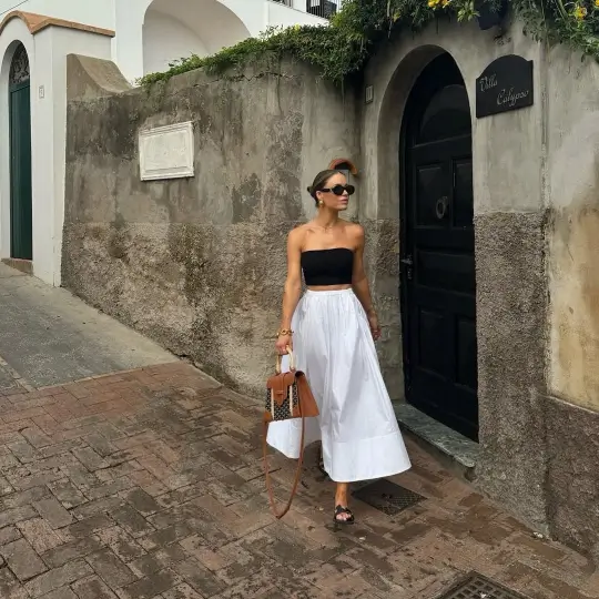 A white maxi skirt is as versatile as it is elegant. Wear it with a tank top for a day at the coast or with a silky blouse for an evening aperitivo. It flows beautifully with every step and pairs effortlessly with both flat sandals and wedges. This is one of those Italian Summer Outfits that works in almost any setting without losing its charm.