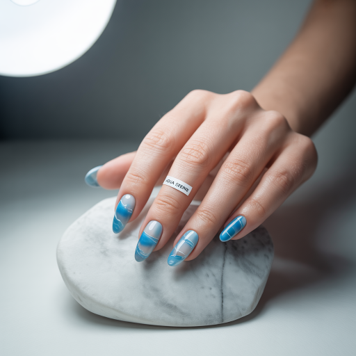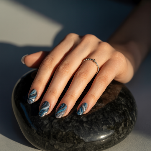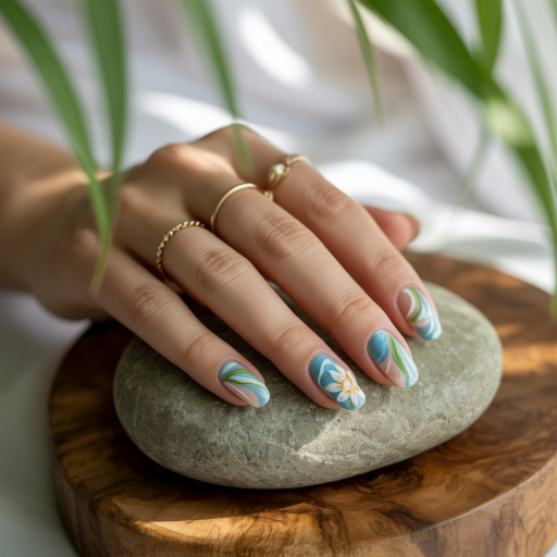 This whimsical design mimics the gentle swirls of wind over the water, using soft blue and white hues. The flowing lines represent the movement of air and water together, creating a calming and fluid design. It’s a beautiful option for those who love light, airy nail art with a nature-inspired twist.