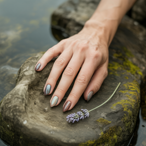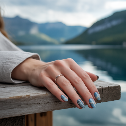 This design mimics the calm reflections you see in a lake’s surface. The nails are painted with a mix of light blues and silvers to capture the shimmering reflection of clouds or trees. Subtle yet striking, this design reflects the peacefulness of nature and is perfect for everyday wear.